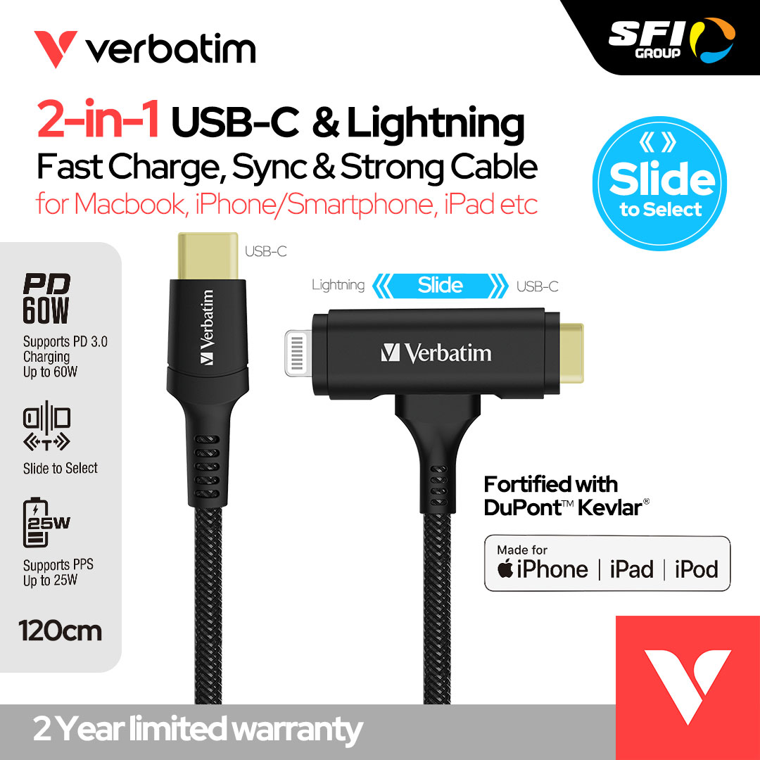 VERBATIM CABLE USB C & LIGHTNING – 60W – 480 Mbps – 120 CM