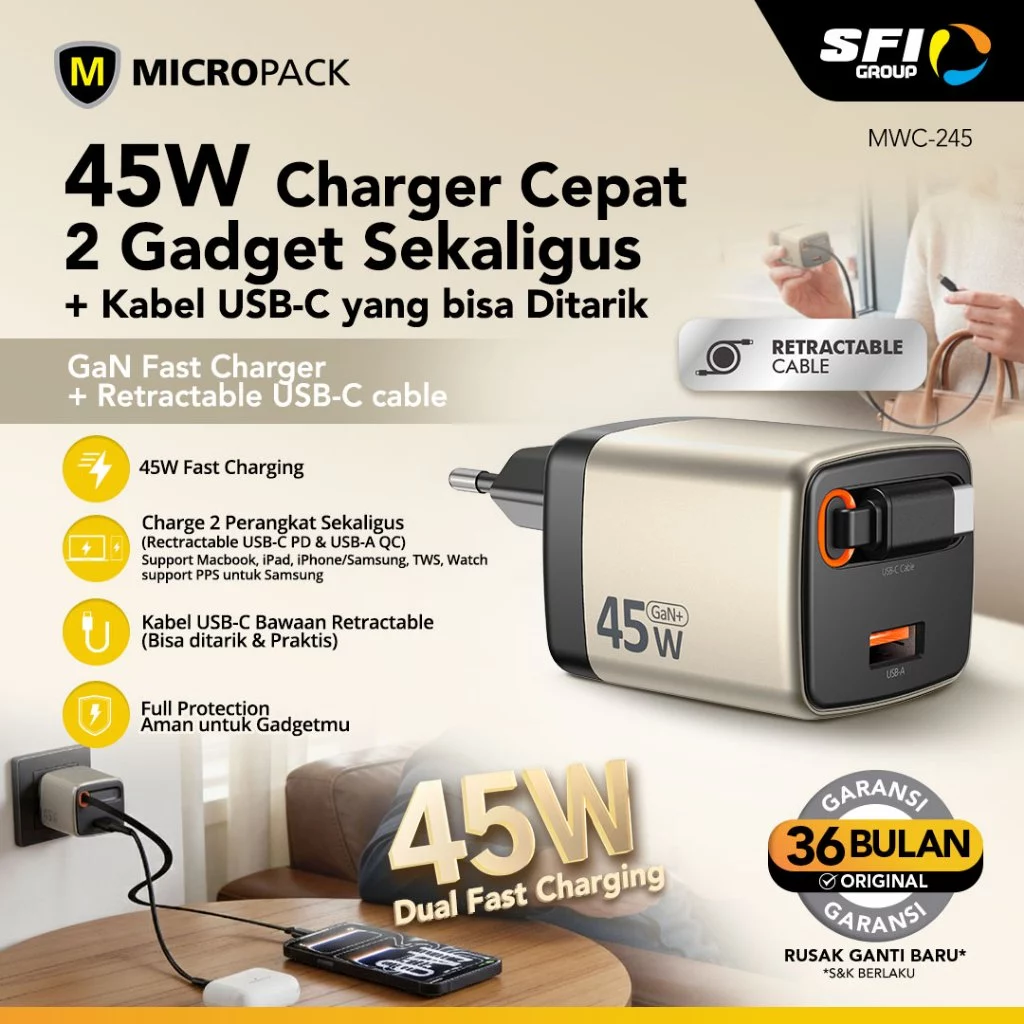 Micropack Wall Charger with Retractable Cable – Fast Charging – 45watt – GaN – Cable USB-C & Port USB-A – MWC-245