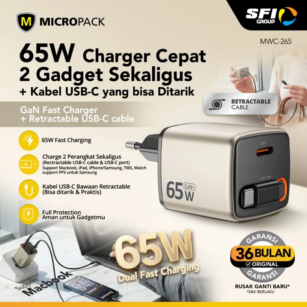 Micropack Wall Charger with Retractable Cable – Fast Charging – 65watt – GaN – Cable USB-C & Port USB-C – MWC-265