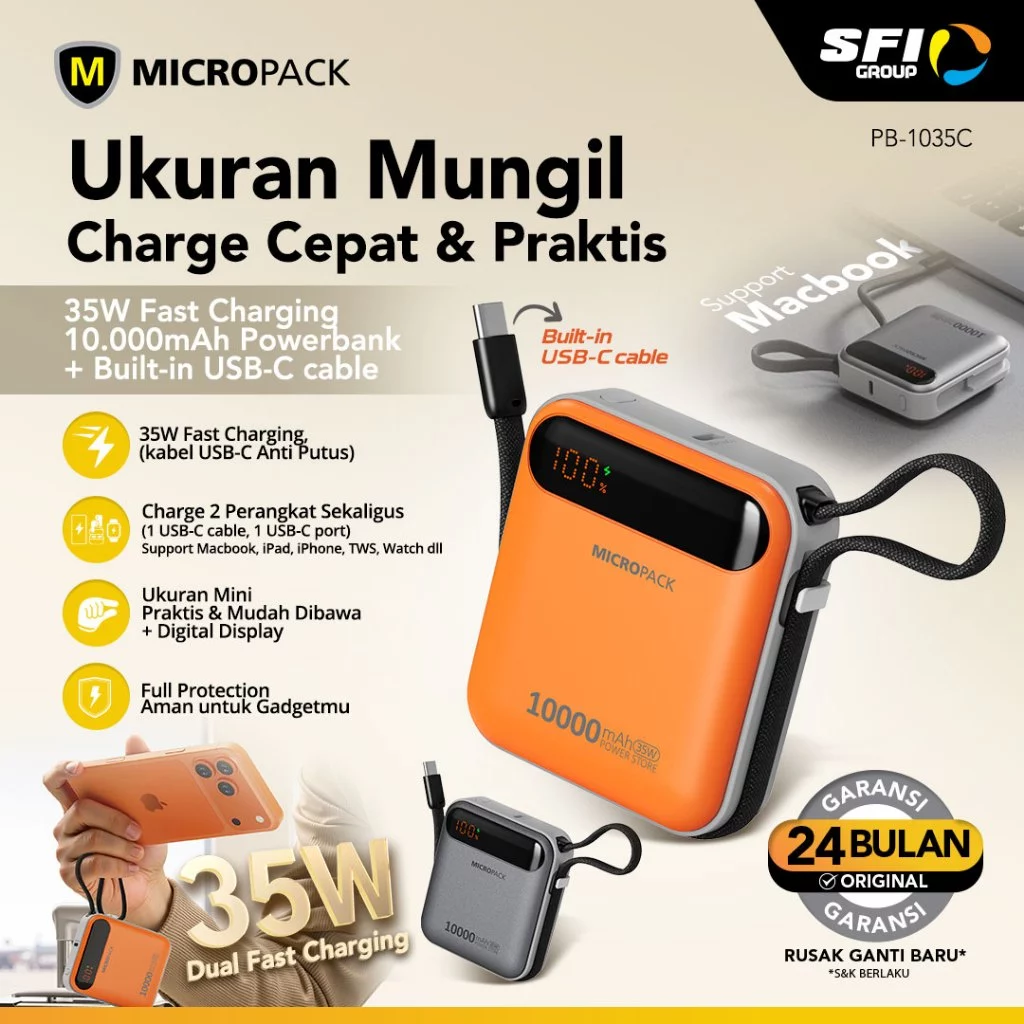 Micropack Powerbank 10.000mAh – Fast Charging 35 watt – 2-in-1 – Detachable USB-C Cable – Power Bank 10000 – PB-1035C