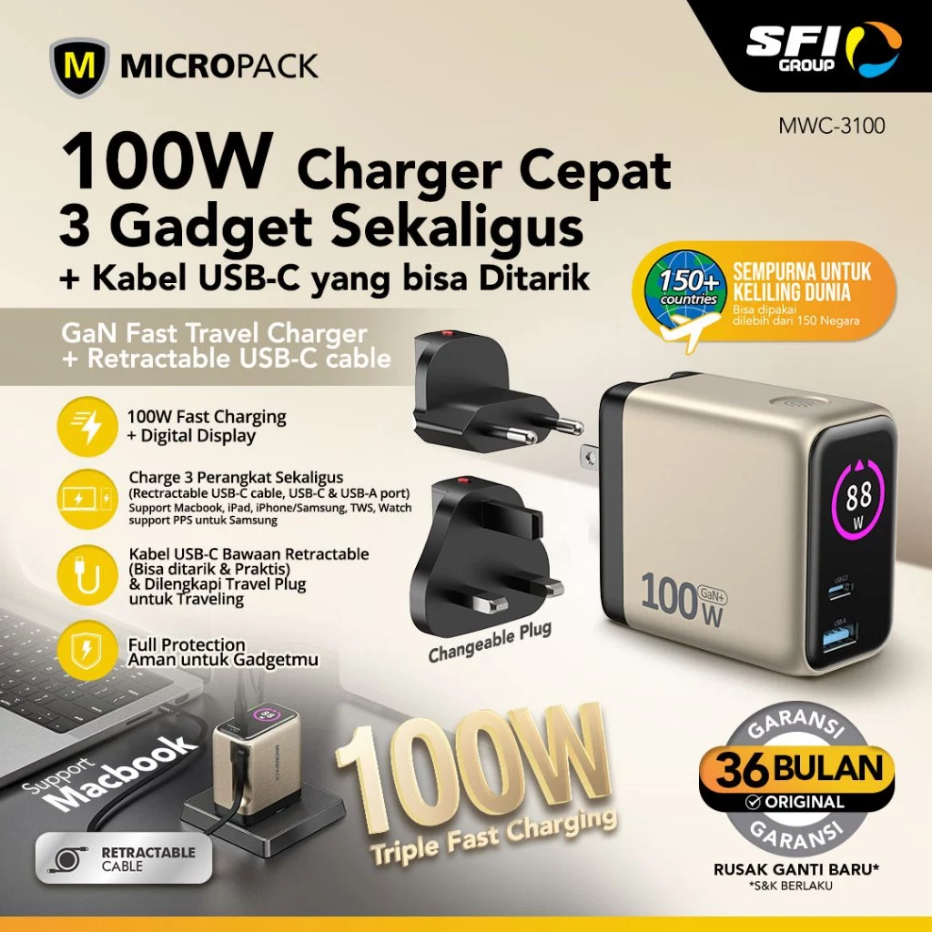 Micropack Wall Charger with Retractable Cable, LED Display, & Travel Plug – Fast Charging – 100watt – GaN – Cable USB-C & Port USB-C & USB-A – MWC-3100
