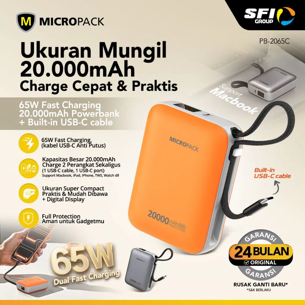 Micropack Powerbank 20.000mAh – Fast Charging 65 watt – 2-in-1 – Detachable USB-C Cable – Power Bank 20000 – PB-2065C